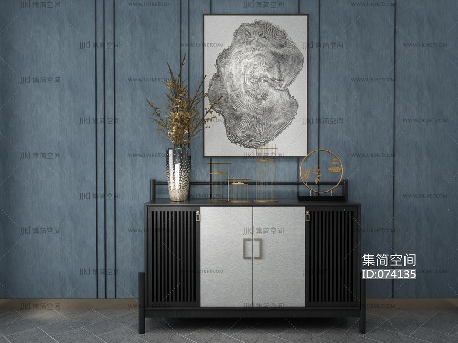 18新中式边柜玄关柜花瓶摆件挂画 3d模型下载 [模型ID:74135]