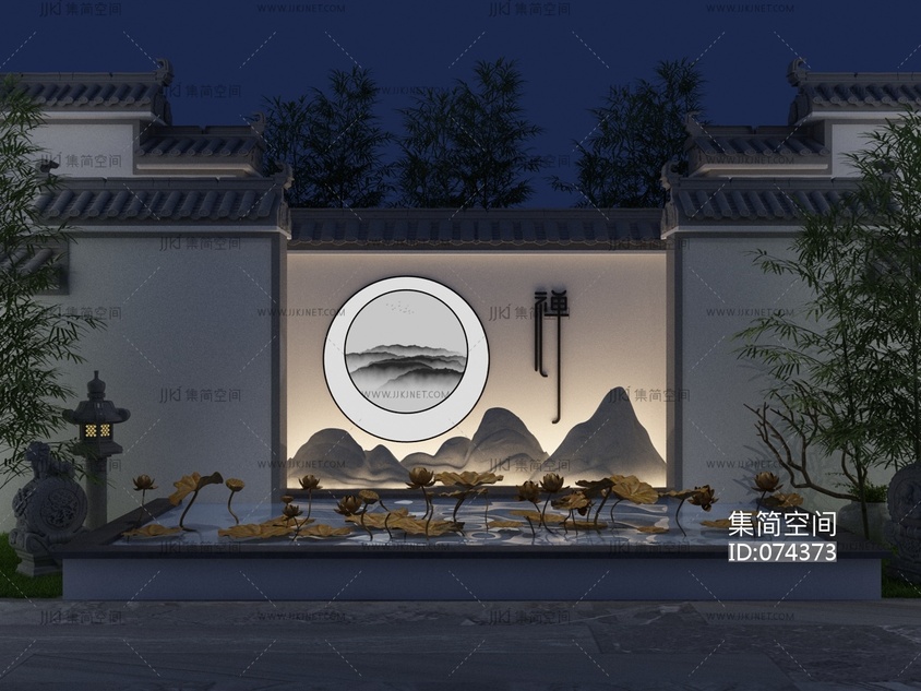 新中式徽派建筑园林景观院墙小品,荷花池,水景,竹子竹林,报鼓庭院石头灯 3d模型下载 [模型ID:74373]