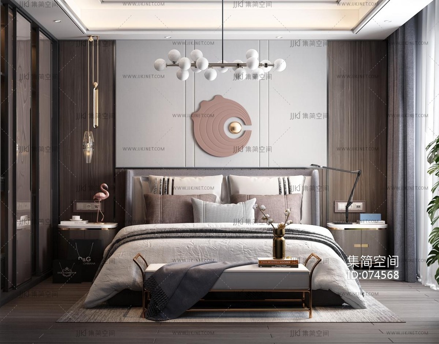 卧室,轻奢,暗黑风,现代轻奢卧室双人床,懒人沙发法式卧室3d模型下载