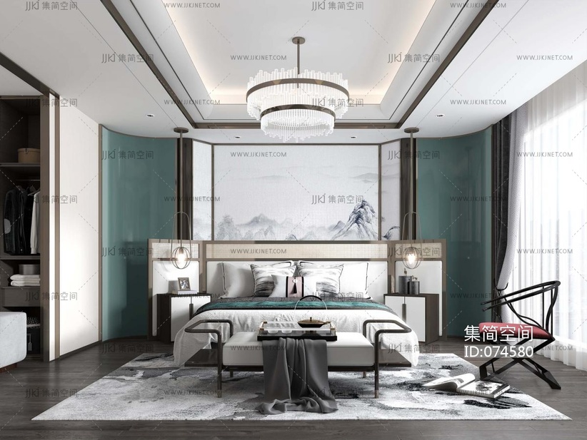 卧室,轻奢,暗黑风,现代轻奢卧室双人床,懒人沙发法式卧室3d模型下载