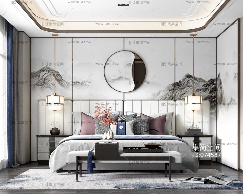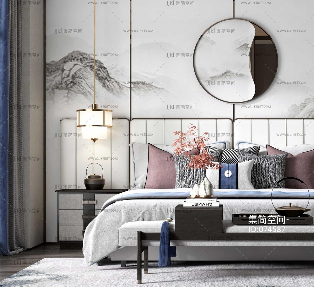 卧室,轻奢,暗黑风,现代轻奢卧室双人床,懒人沙发法式卧室3d模型下载
