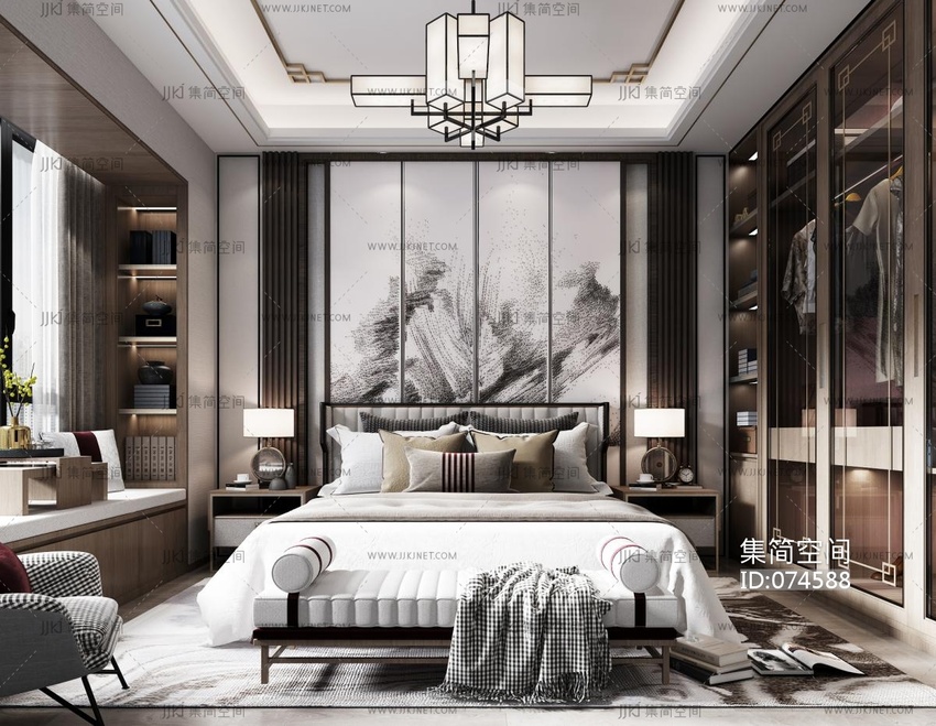 卧室,轻奢,暗黑风,现代轻奢卧室双人床,懒人沙发法式卧室3d模型下载