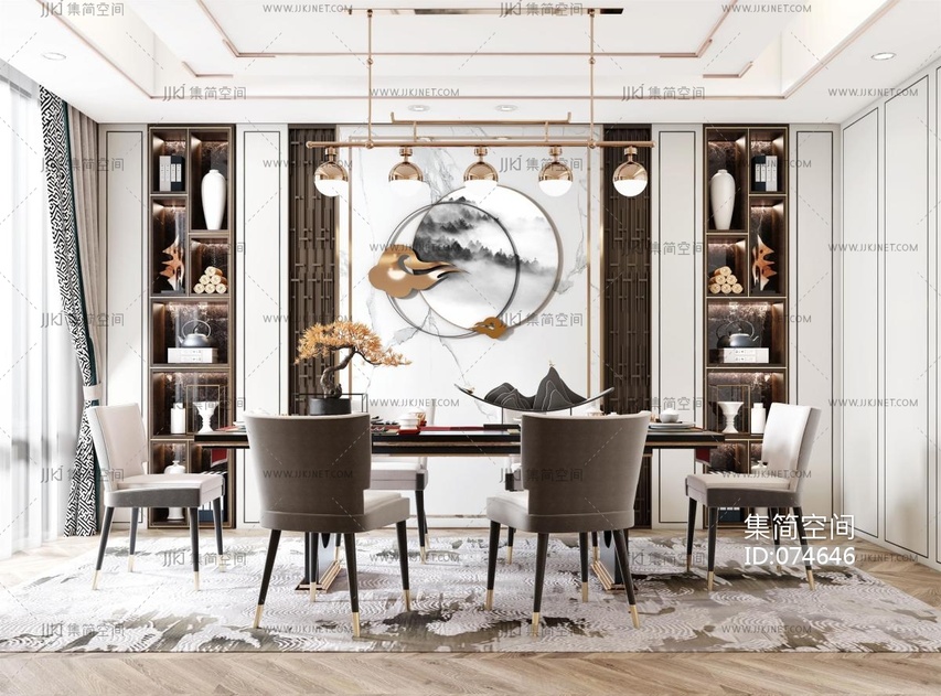 02新中式餐厅,餐桌椅,窗帘盆景 3d模型下载 [模型ID:74646]