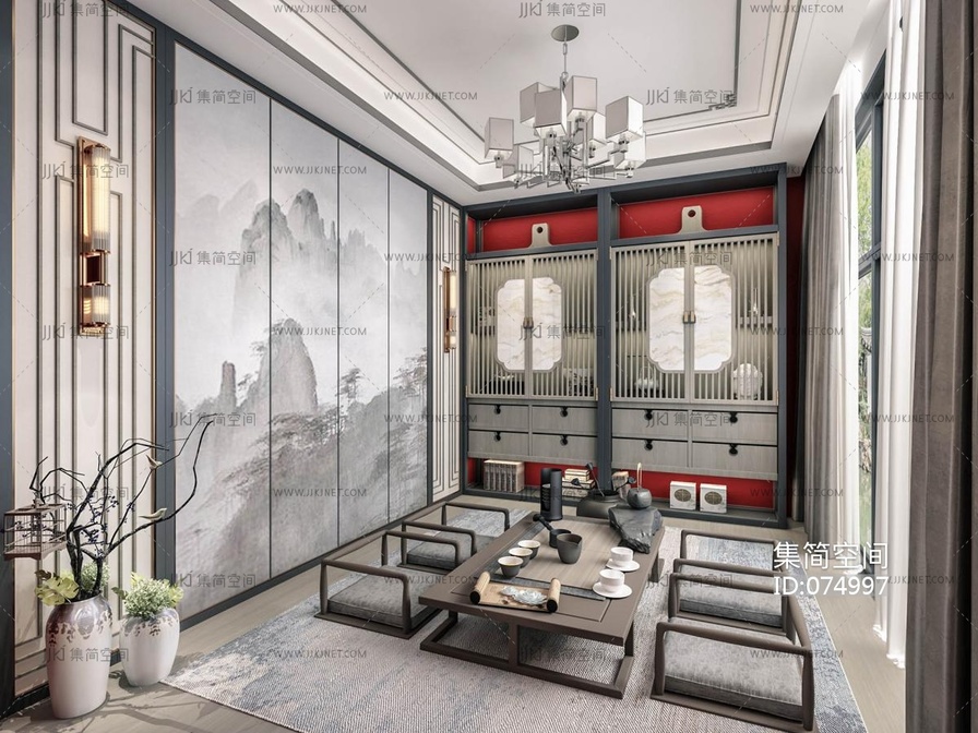 新中式茶室,茶桌椅炕桌,茶具书柜花瓶 3d模型下载 [模型ID:74997]