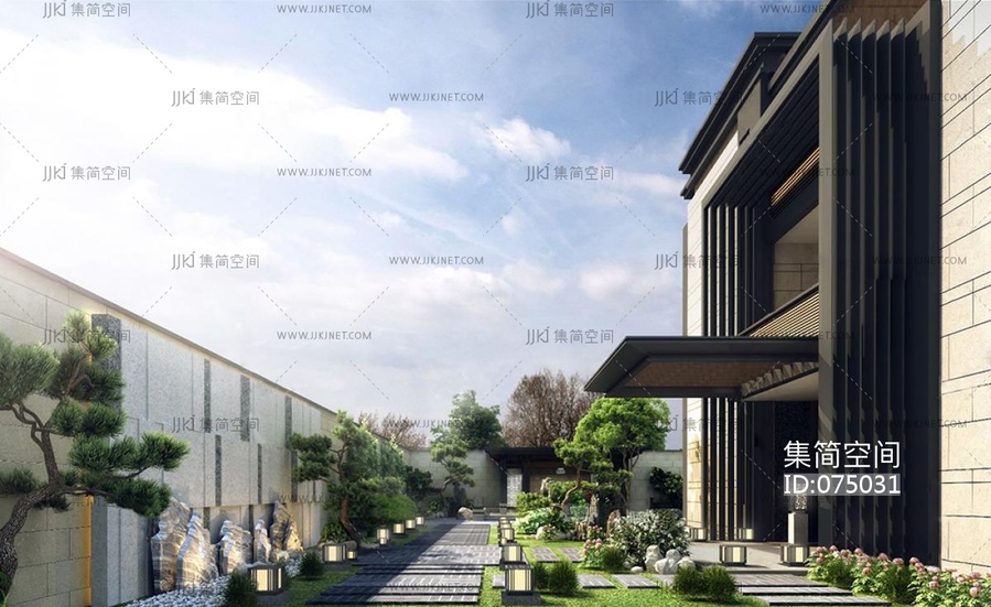 新中式别墅庭院景观花园,松树植物 3d模型下载 [模型ID:75031]