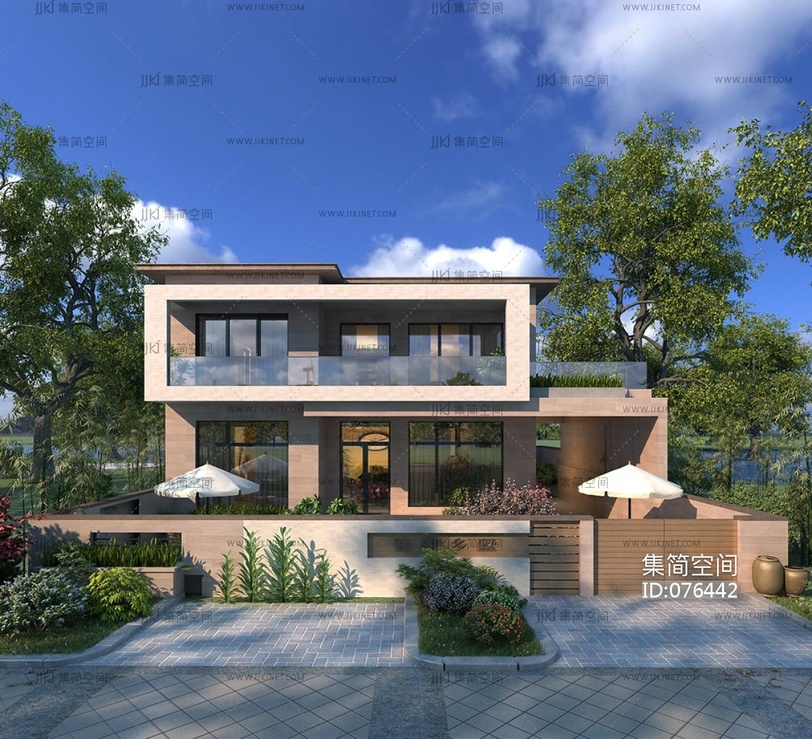 现代独栋别墅外观,景观树,灌木 3d模型下载 [模型ID:76442]
