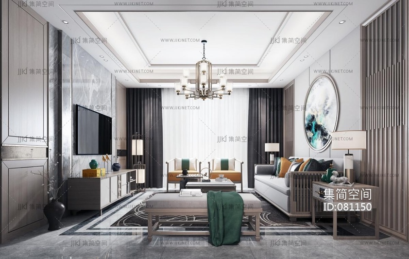 新中式样板间客厅,沙发茶几电视柜 3d模型下载 [模型ID:81150]