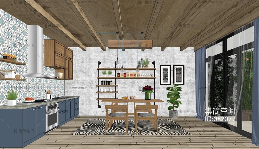 北欧厨房,橱柜,装饰架挂饰,餐桌椅 su草图模型下载 [模型ID:82077]