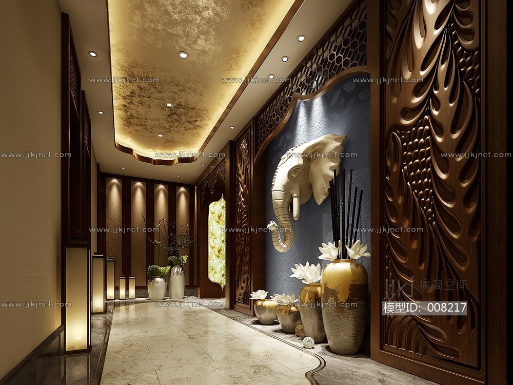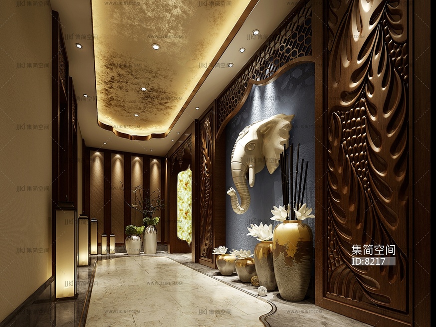 169-1022泰式东南亚spa会所走廊大象头屏风隔断陶罐干枝 3d模型下载 [模型ID:8217]