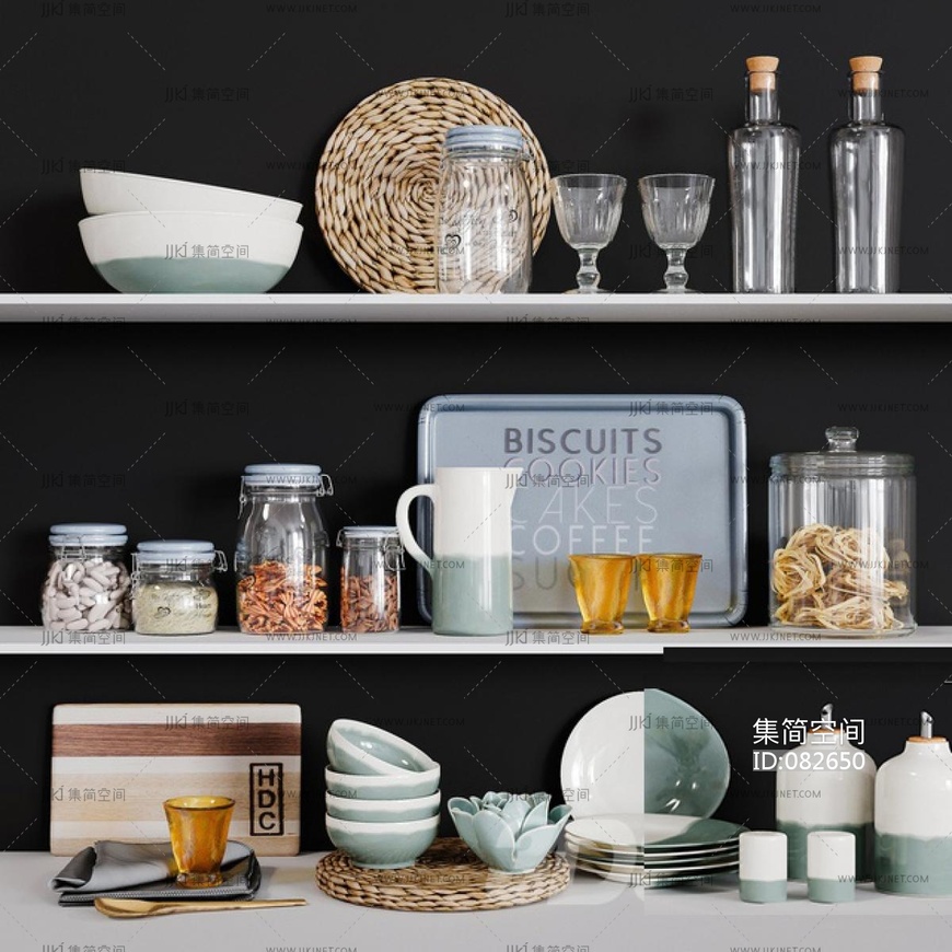 厨房用品,玻璃调料罐瓶子碗,盘子,置物架 3d模型下载 [模型ID:82650]