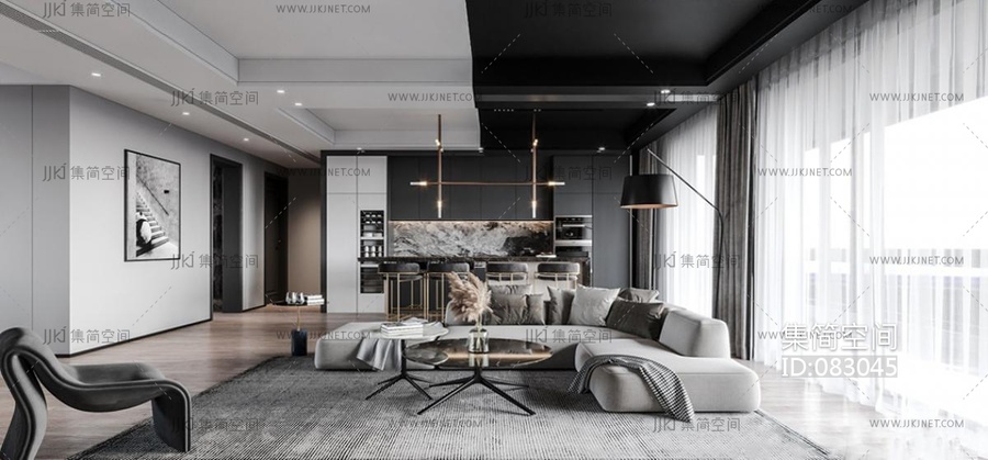 高级灰客餐厅,厨房橱柜,转角沙发,异形单椅 3d模型下载 [模型ID:83045]