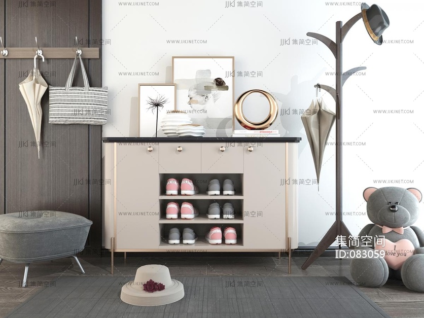 现代鞋柜,衣架,帽子,雨伞鞋子 3d模型下载 [模型ID:83059]