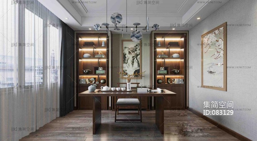 新中式风格书房,书桌椅,茶具,吊灯书柜 3d模型下载 [模型ID:83129]