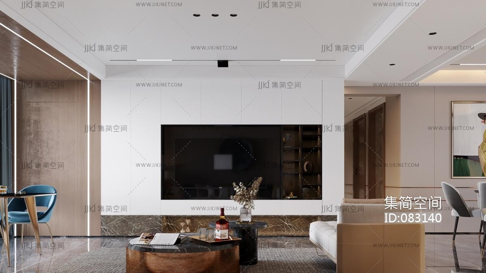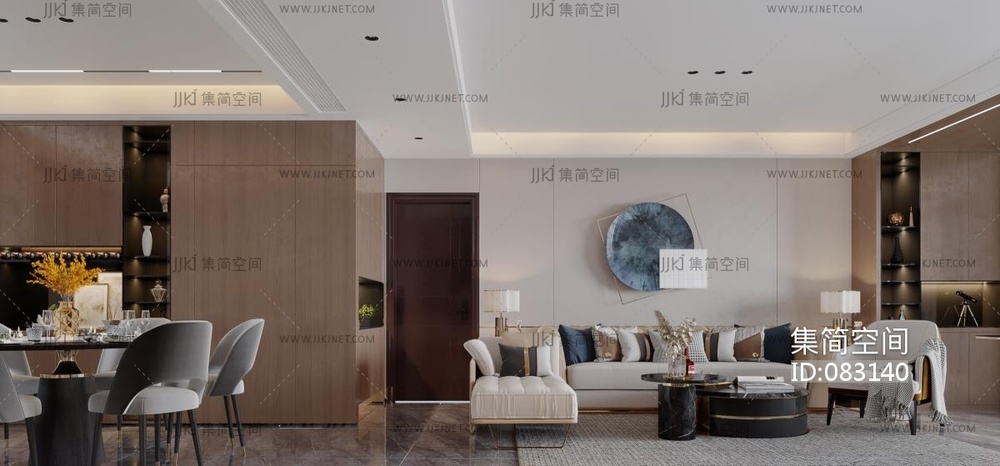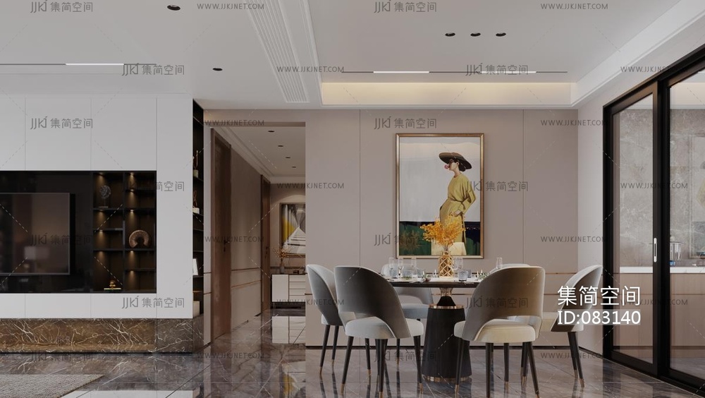 轻奢客餐厅,简欧式沙发,卧榻,贵妃榻,椅, 圆形餐桌椅子,边几灯几 (1) 3d模型下载 [模型ID:83140]