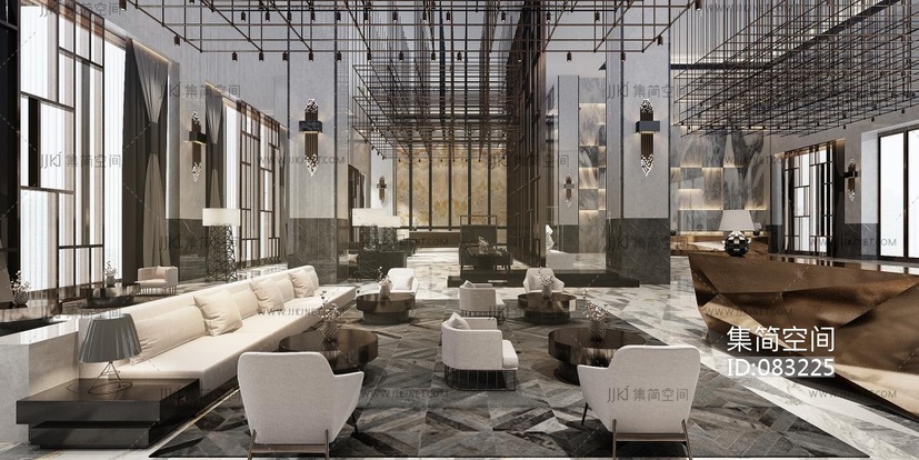 酒店售楼处接待大堂,大堂吧,网格铁网造型吊灯 3d模型下载 [模型ID:83225]