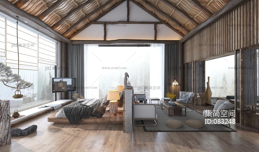 新中式自然风民宿酒店民宿客房,卧室 3d模型下载 [模型ID:83248]