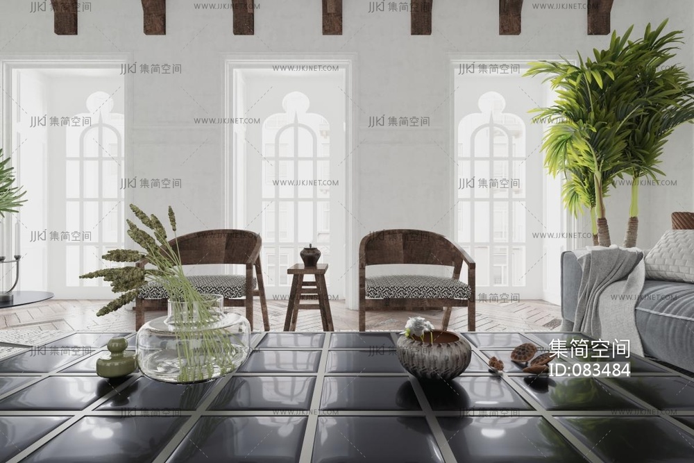 中古风客厅 沙发茶几组合 背景墙3d模型下载