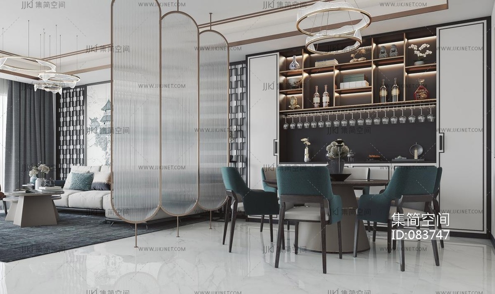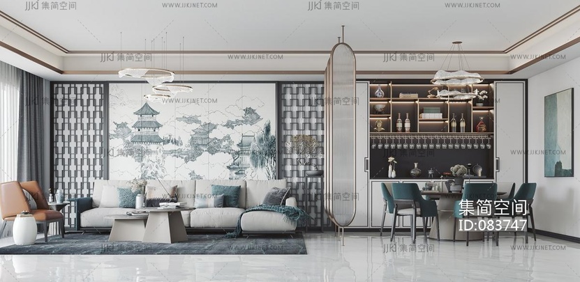 新中式风格客厅餐厅,转角沙发, 3d模型下载 [模型ID:83747]