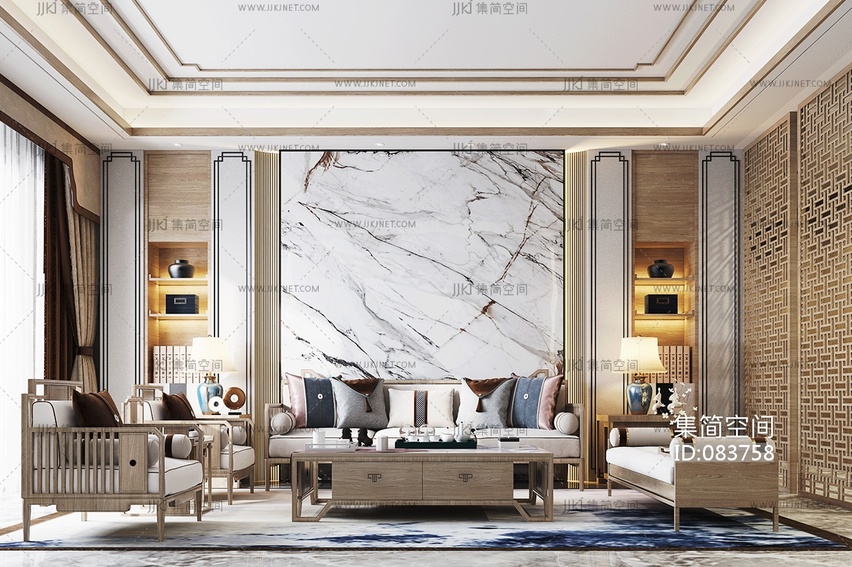新中式客厅,沙发茶几单人沙发 3d模型下载 [模型ID:83758]
