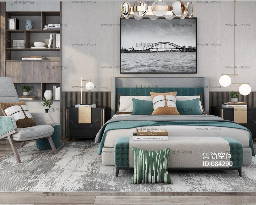 新中式简欧式双人床,休闲椅床头柜床尾凳 3d模型下载 [模型ID:84290]