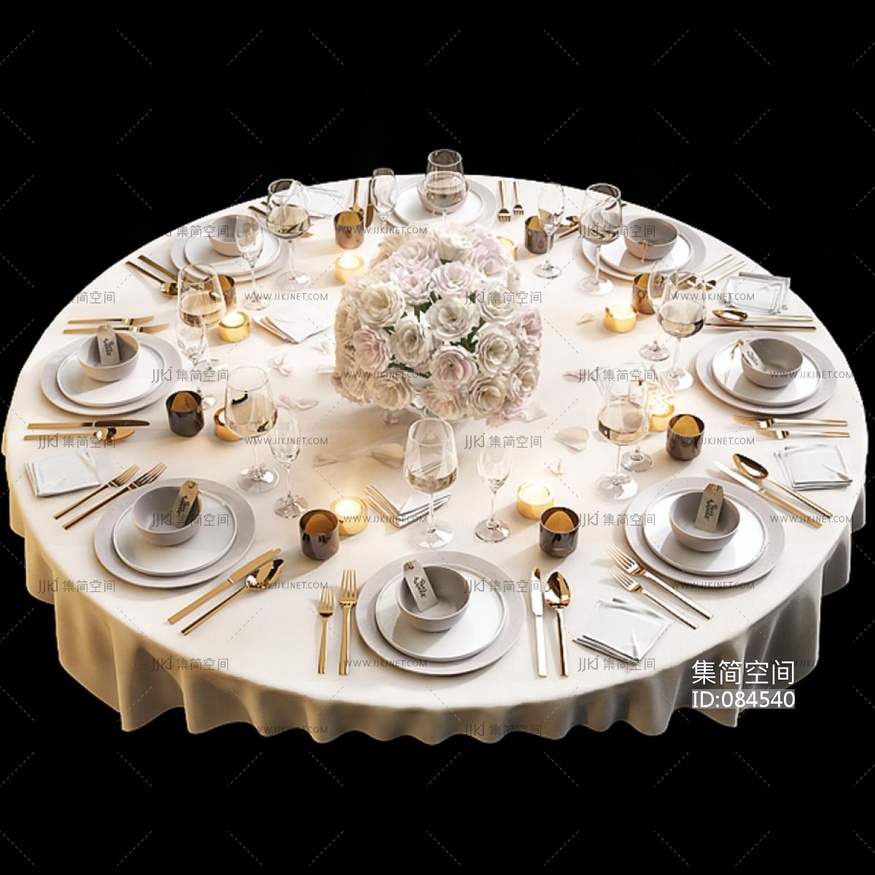Table setting 11圆形餐桌桌布,餐具团花玫瑰花 3d模型下载 [模型ID:84540]