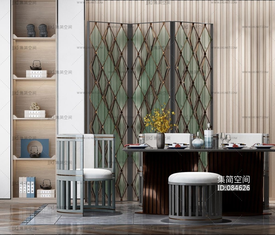 新中式餐桌椅,玻璃铁艺屏风隔断 3d模型下载 [模型ID:84626]