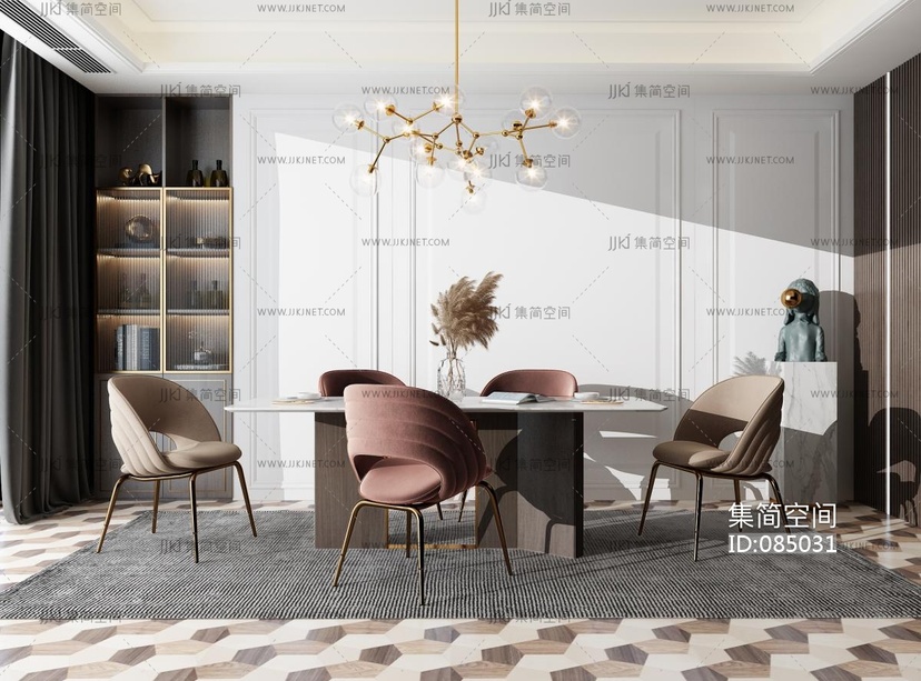 现代轻奢餐厅,餐桌椅圆形灯泡吊灯 3d模型下载 [模型ID:85031]