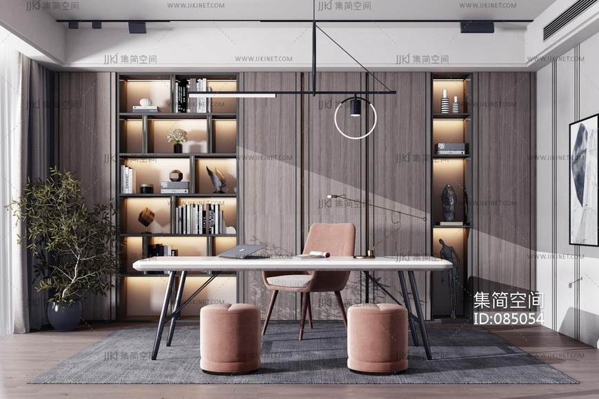 现代书房,书桌椅,圆形坐墩,书柜 3d模型下载 [模型ID:85054]