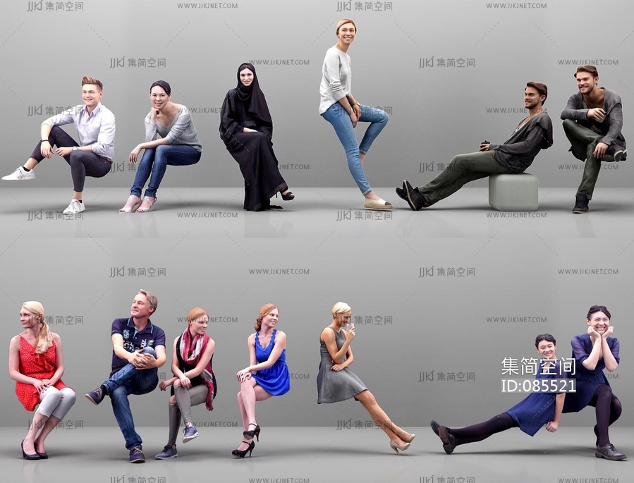 现代坐姿青年男女人物,坐着的人物美女 3d模型下载 [模型ID:85521]