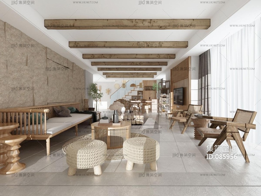 新中式自然风民宿客厅餐厅,沙发椅子边几 3d模型下载 [模型ID:85956]