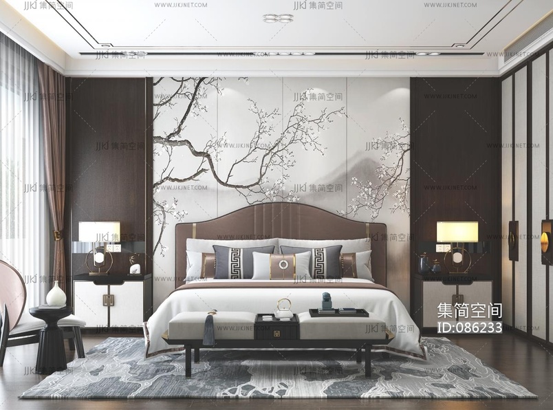 新中式主卧室双人床,床头柜,床尾凳,榻,休闲椅 3d模型下载 [模型ID:86233]