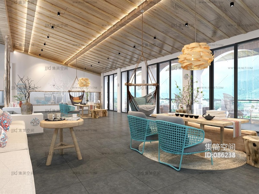 北欧现代自然风民宿,休闲室,茶室茶桌椅,单椅,吊灯吊椅 3d模型下载 [模型ID:86238]