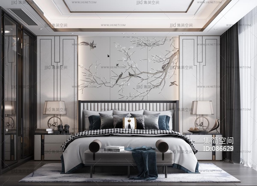 新中式卧室,双人床,床尾凳,床尾榻,床头柜台灯 3d模型下载 [模型ID:86629]