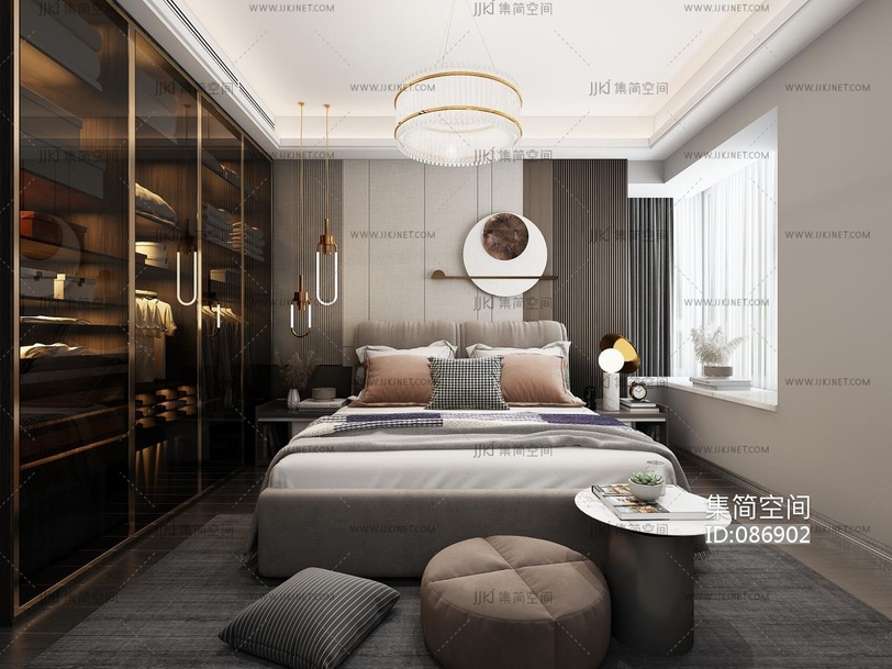 卧室,轻奢,暗黑风,现代轻奢卧室双人床,懒人沙发法式卧室3d模型下载