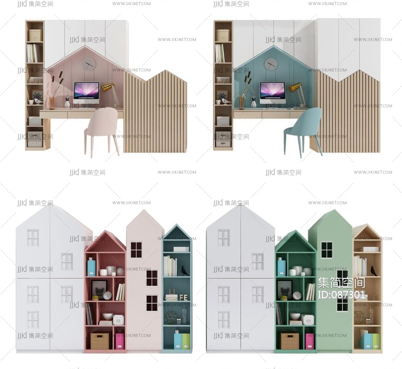 北欧儿童书桌书柜,玩具柜,收纳柜, 3d模型下载 [模型ID:87301]