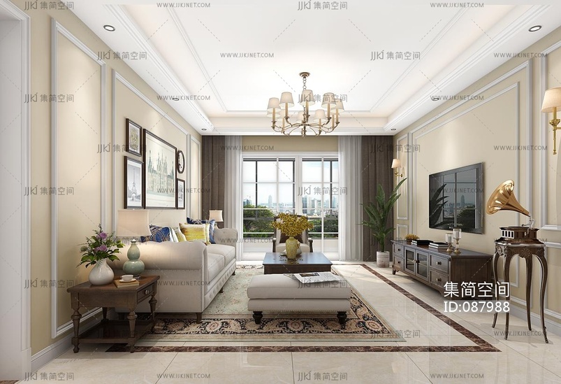 中古风客厅,美式客厅,圆形茶几,装饰画,移动电视,3d模型下载
