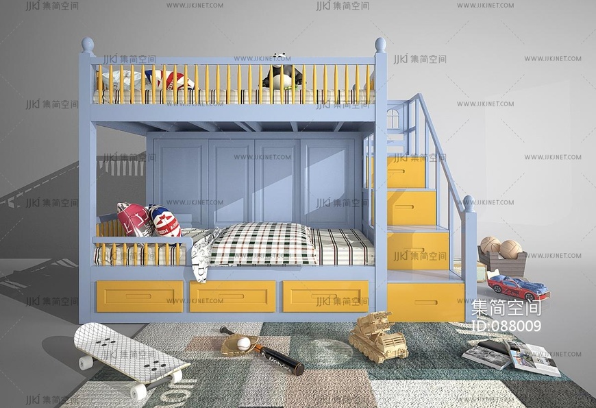 Z19-0715美式欧式上下铺儿童床,滑板车,棒球棒球手套 3d模型下载 [模型ID:88009]