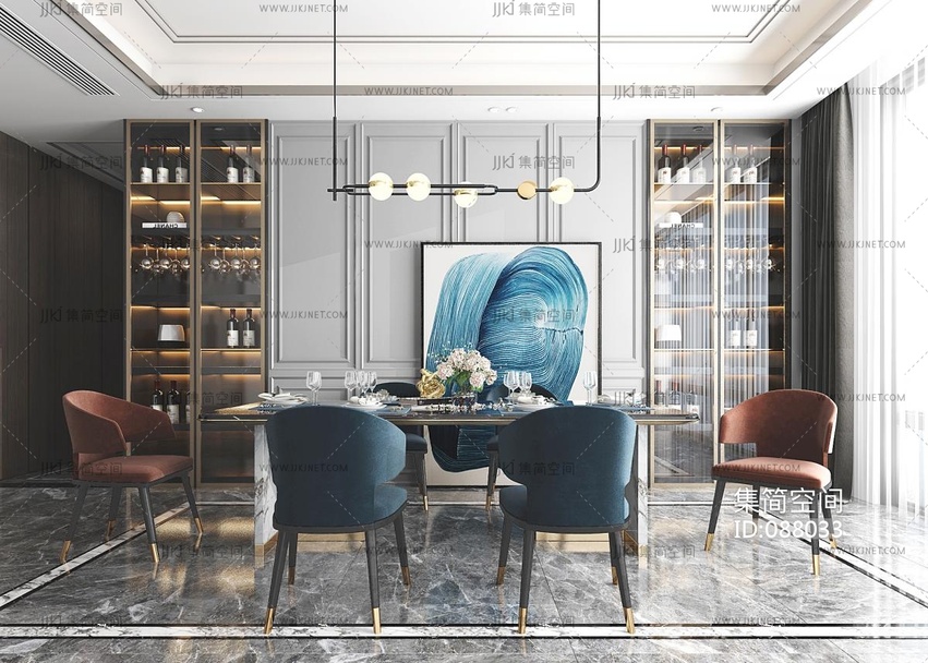 Z22-0721现代轻奢餐厅,餐桌椅,酒柜吊灯 3d模型下载 [模型ID:88033]