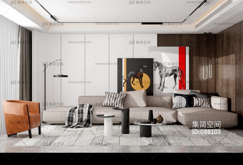 中古风客厅,美式客厅,圆形茶几,装饰画,移动电视,3d模型下载