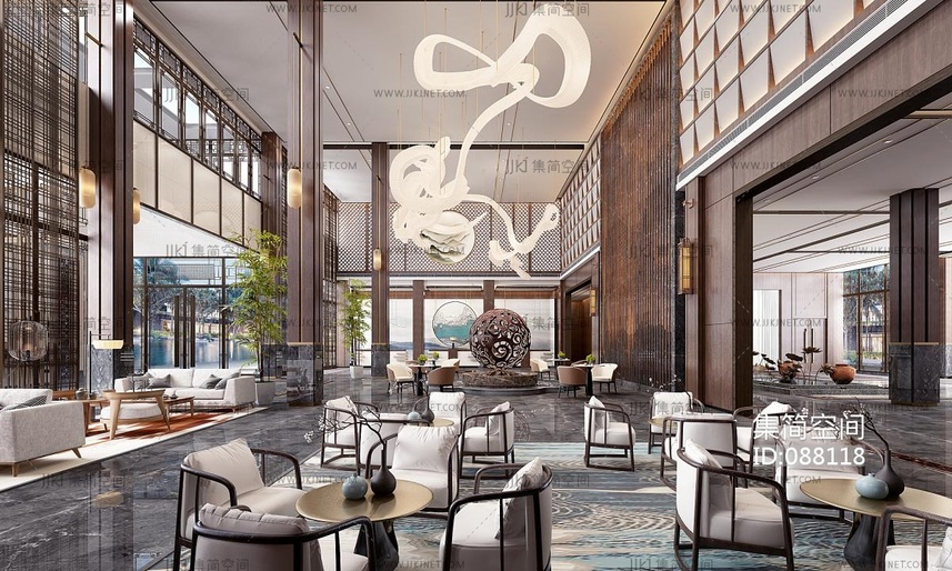 新中式酒店大堂,大堂吧 3d模型下载 [模型ID:88118]