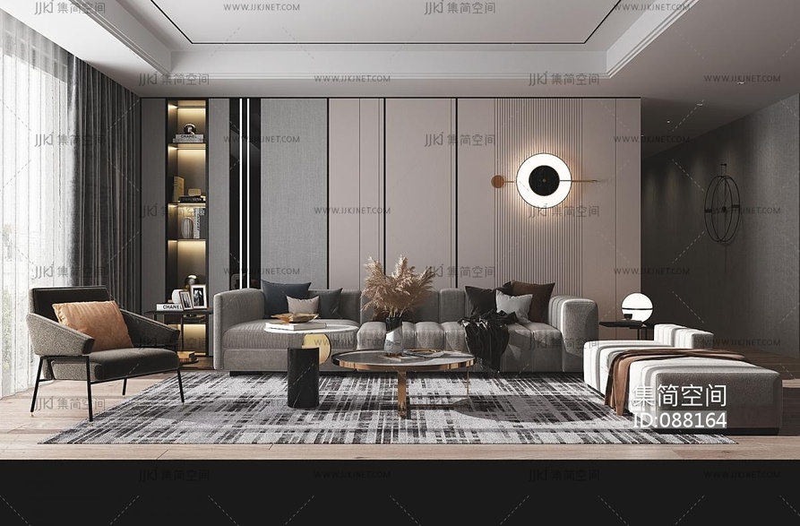 中古风客厅,美式客厅,圆形茶几,装饰画,移动电视,3d模型下载