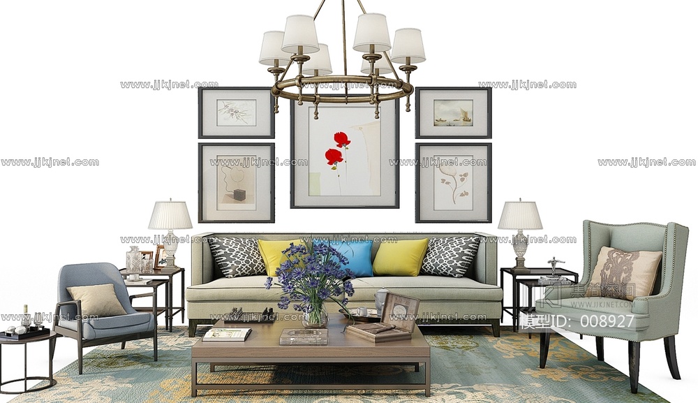 Z13-0913简欧沙发茶几吊灯组合 3d模型下载 [模型ID:8927]