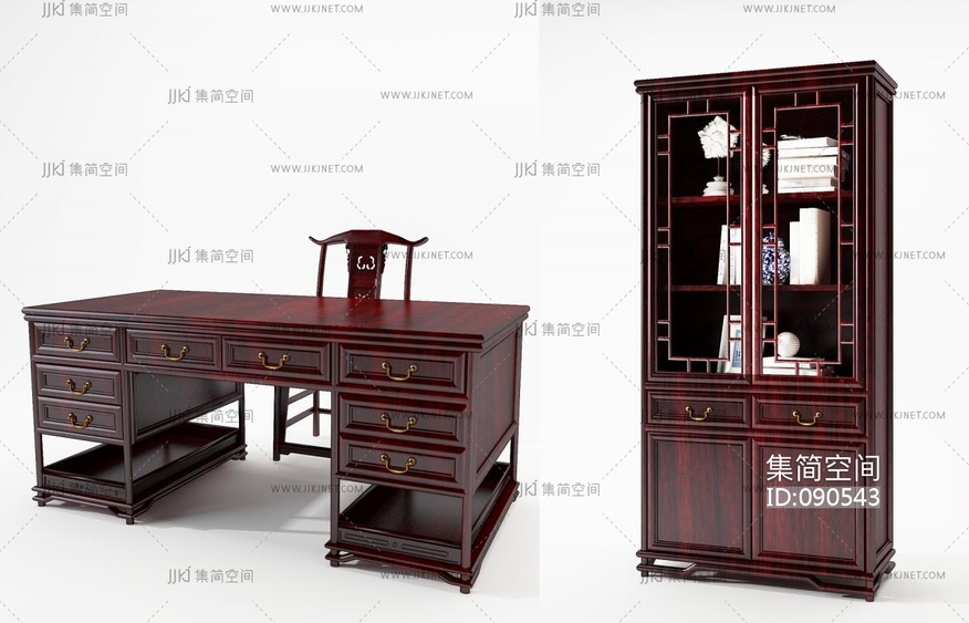 中式古典红木书桌椅,官帽椅,书柜 3d模型下载 [模型ID:90543]