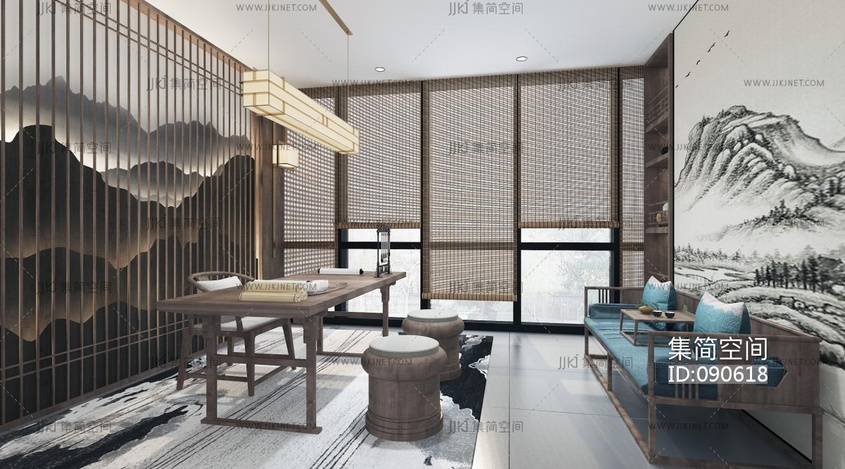 现代书房 书桌椅 壁柜 挂画 吊灯 书 盆栽 摆件3d模型下载