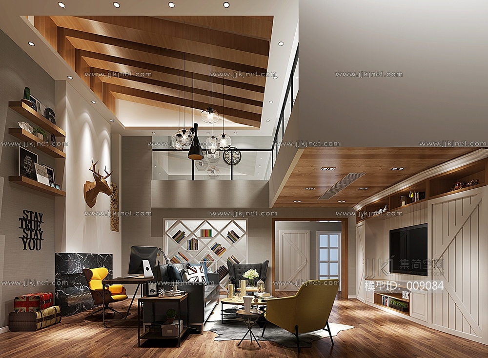 中古风客厅,美式客厅,圆形茶几,装饰画,移动电视,3d模型下载