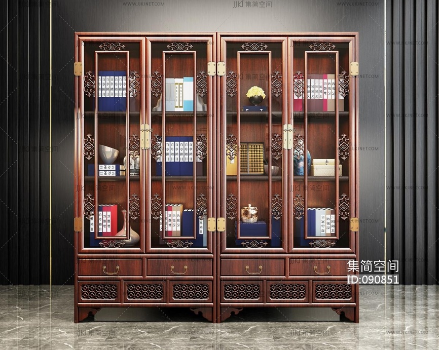 中式古典红木实木雕花书柜 3d模型下载 [模型ID:90851]