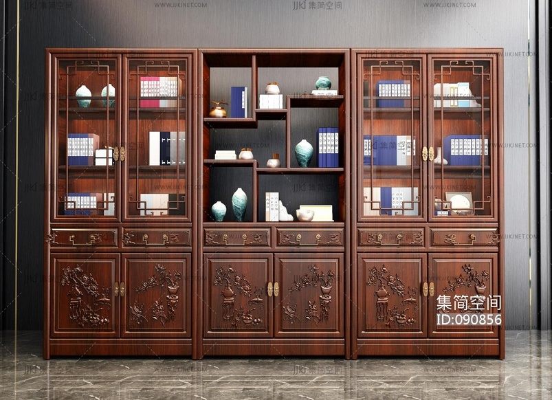 中式古典红木实木雕花,书柜 3d模型下载 [模型ID:90856]