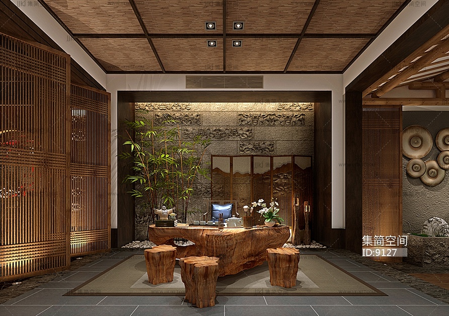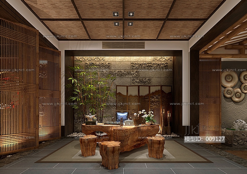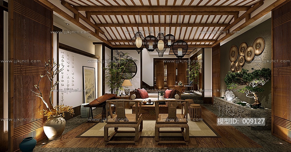 68-1104中式会客厅、茶室茶海古筝 (1) 3d模型下载 [模型ID:9127]