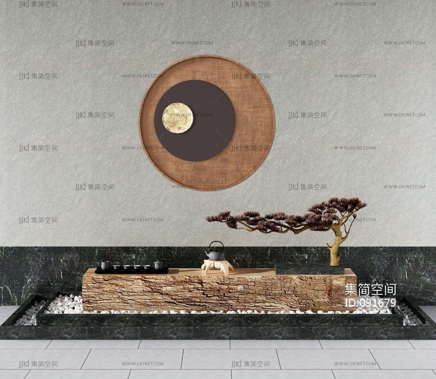 新中式景观小品,木头景观墙茶具 3d模型下载 [模型ID:91679]