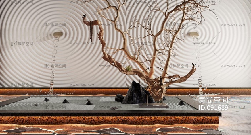新中式枯树,水景背景墙景观小品 3d模型下载 [模型ID:91689]